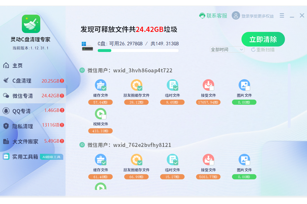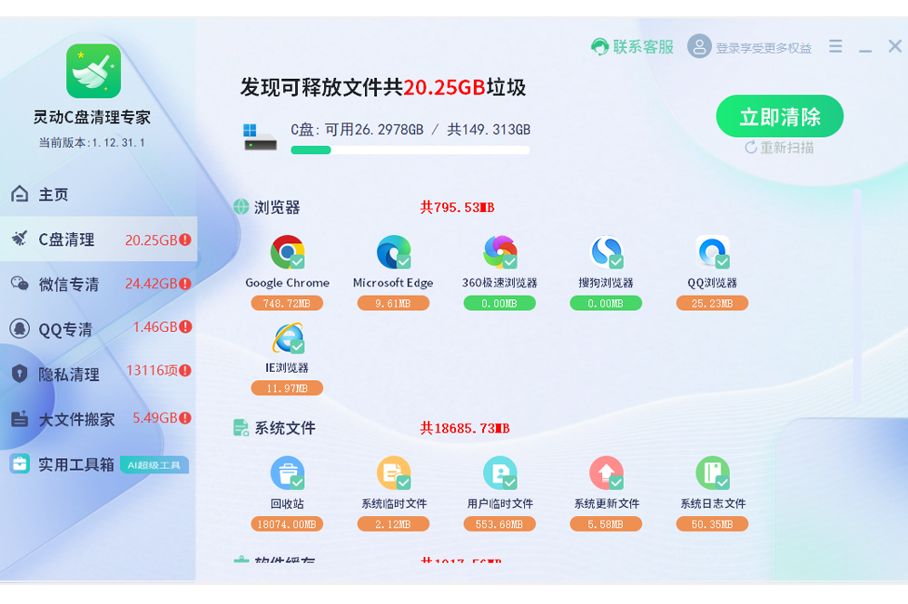 一键清理C盘不误删,立即释放超大C盘空间!